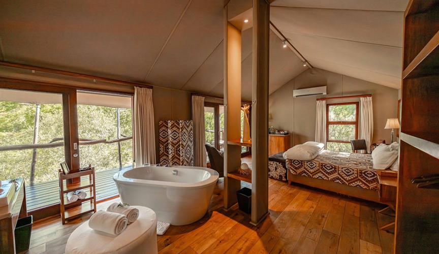 This luxury tented camp, in Kapama Private Game Reserve near the Kruger National Park, is a quiet and intimate lodge where you can unwind in the shade of the trees and simply absorb the surrounding peace. The perfect luxury South African Safari escape.